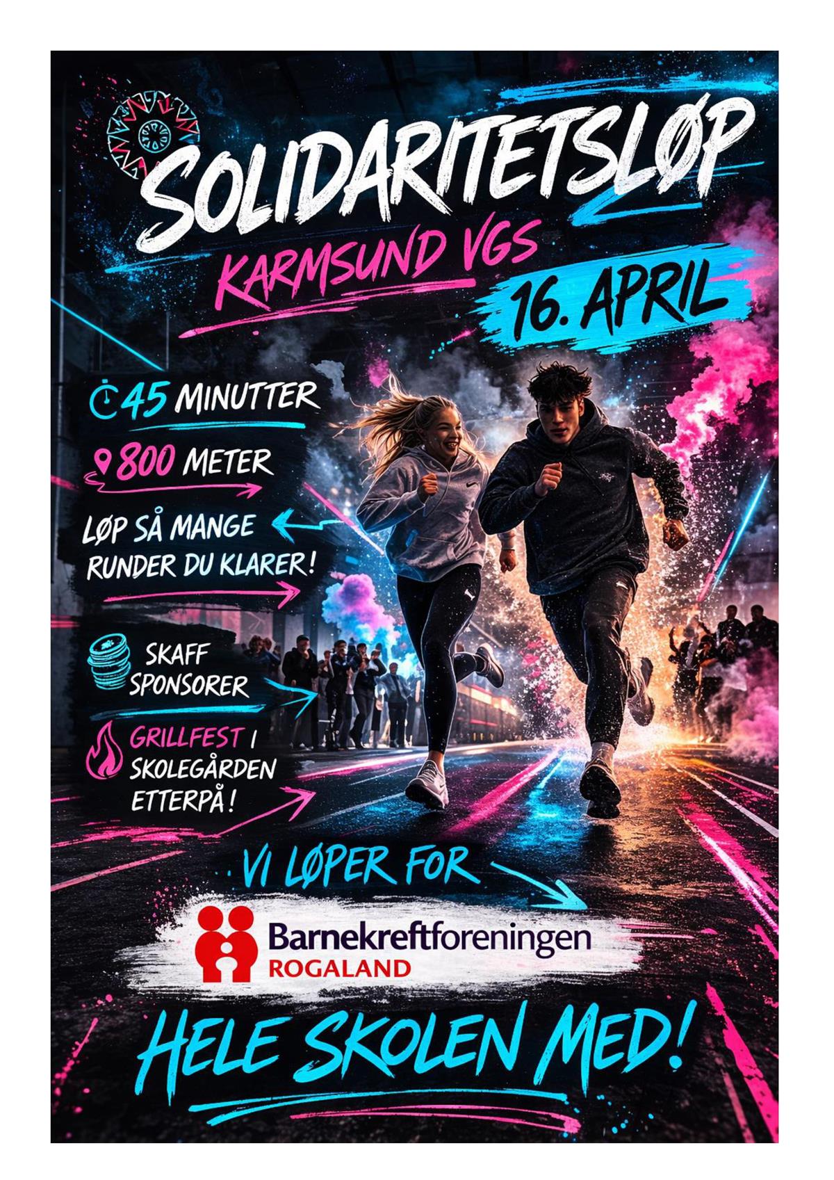 Karmsund videregående skole arrangerer torsdag 16. april årets solidaritetsaksjon i form av et sponsorløp. Dette har de siste årene vært en svært positiv og samlende dag for både elever og ansatte.